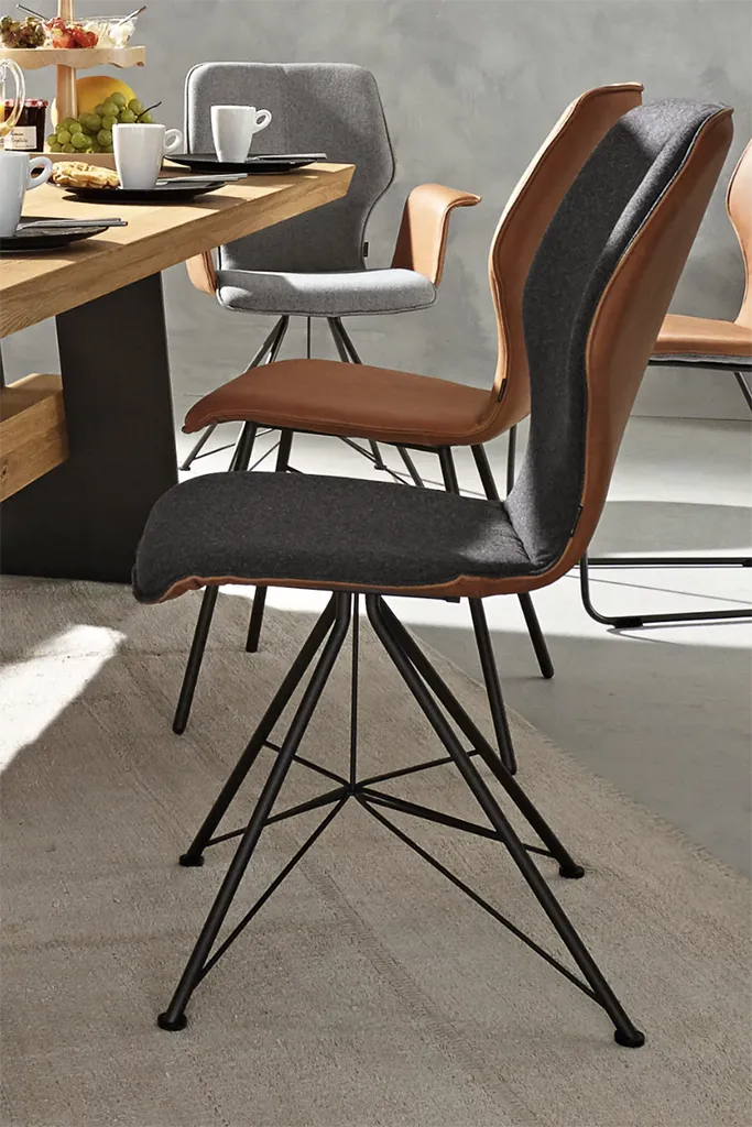 Doordat de Nevio eetkamerstoelen van Musterring zeer veelzijdig zijn kunt u bijvoorbeeld een statement maken door verschillende onderstellen om de eetkamertafel te zetten. Pas de lakkleur van het onderstel aan in combinatie met de bekleding en voilà… zo creëert u uw persoonlijke eetkamerstoel!