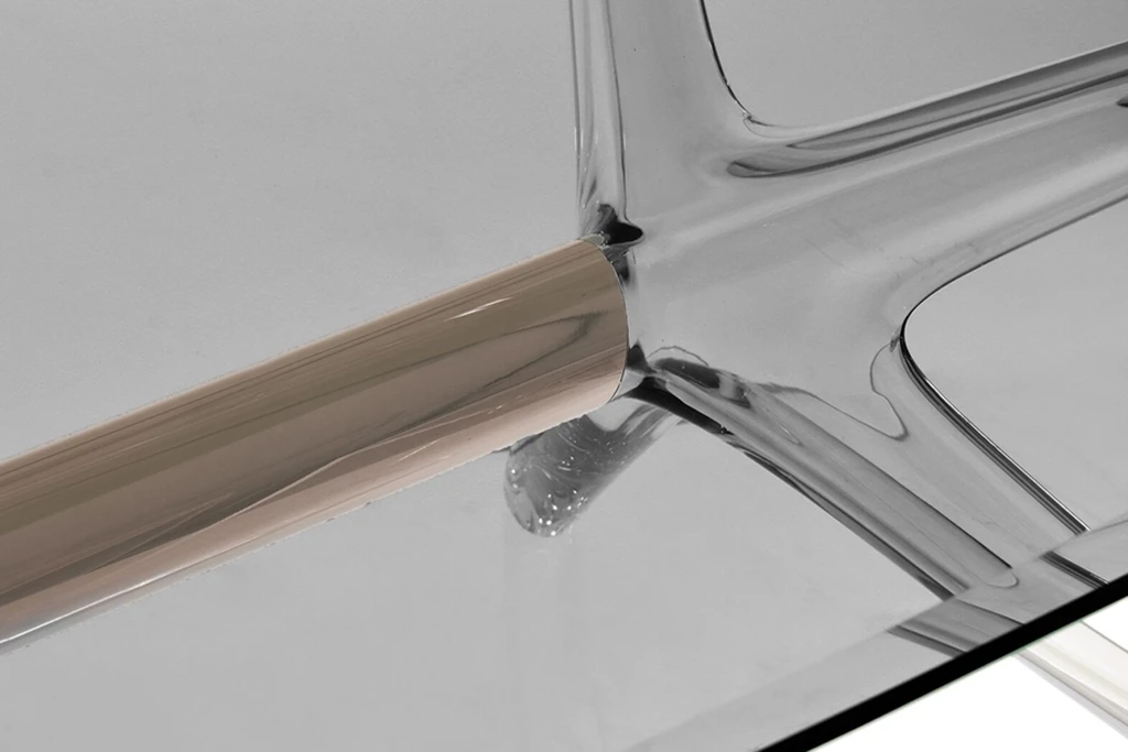 Het frame is gemaakt van polycarbonaat en heeft een luchtig lichteffect. Dankzij het innovatieve design is het frame ondanks het delicate uiterlijk uiterst robuust. Het lichtgekleurde glazen tafelblad is nog steeds transparant genoeg om het ondersteunende frame eronder te kunnen zien.