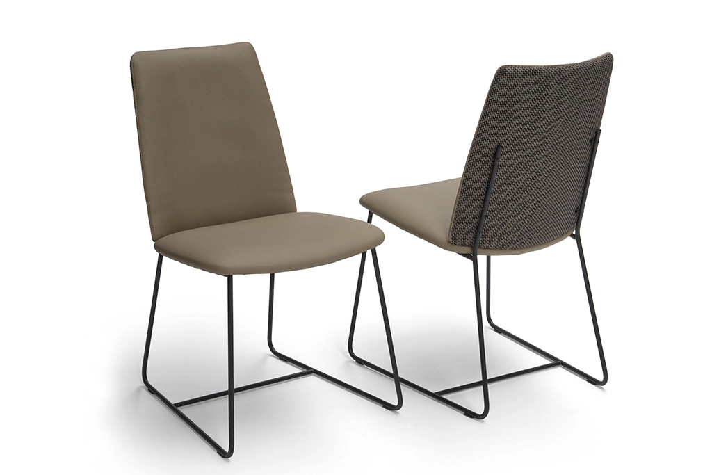 Het metalen sledeframe van de City eetkamerstoel, dat als een functionele ondersteuning om de zachte zitdelen valt is een echte eye-catcher door het slanke en open ontwerp wat doorloopt op de achterkant van de rugleuning.