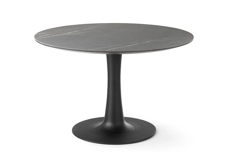 De eetkamertafel is leverbaar met een ronde of ovale vorm, zodat er een maximaal aantal mensen kunnen zitten, zonder last te hebben van de tafelpoten. De voet en het zeer dunne tafelblad worden verbonden door een rechte kolom.