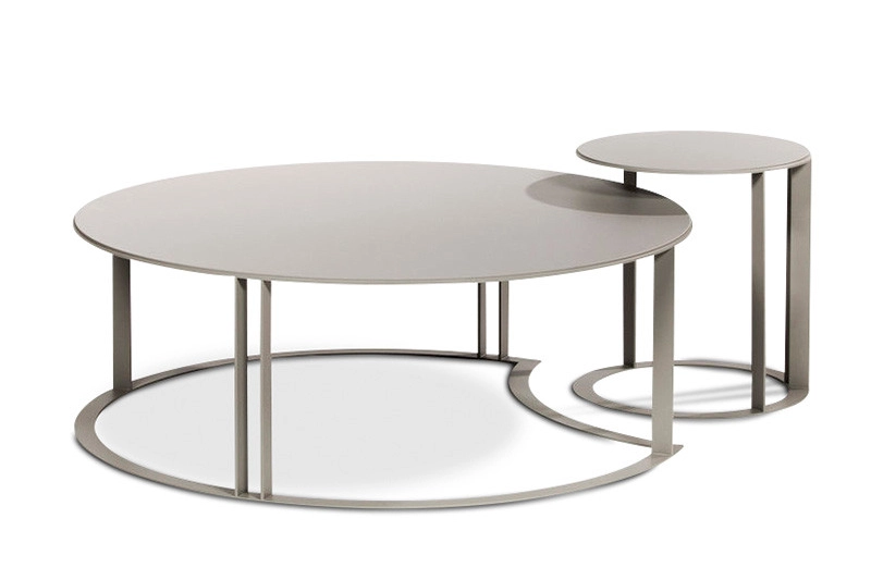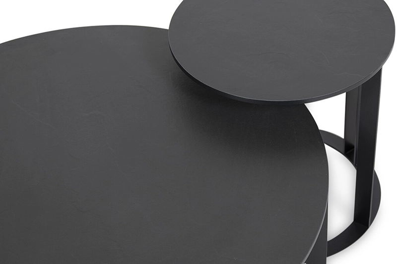 De Dujo is een set van salontafel en bijzettafel met een onderstel van gelakt staal. Het blad is van keramiek.