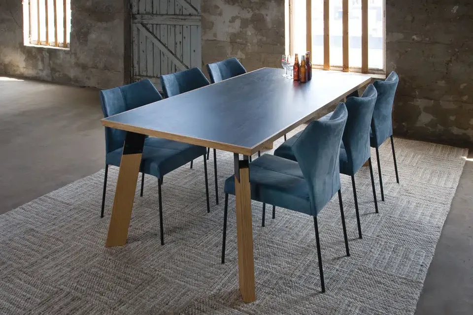Het design van de eetkamerstoel Fly kenmerkt zich door de sterke, grafische lijn van de achterpoot. Die springt als een roofdier naar voren en vormt ook een onderdeel van de rug.