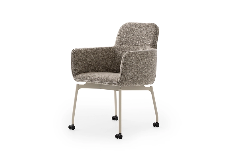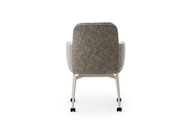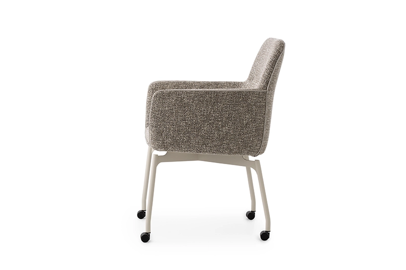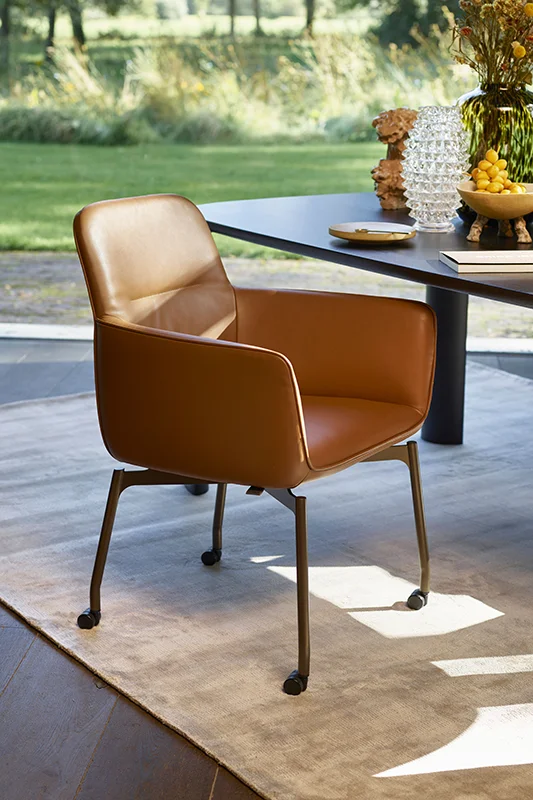 Eetkamerstoel met armleuningen op wieltjes.