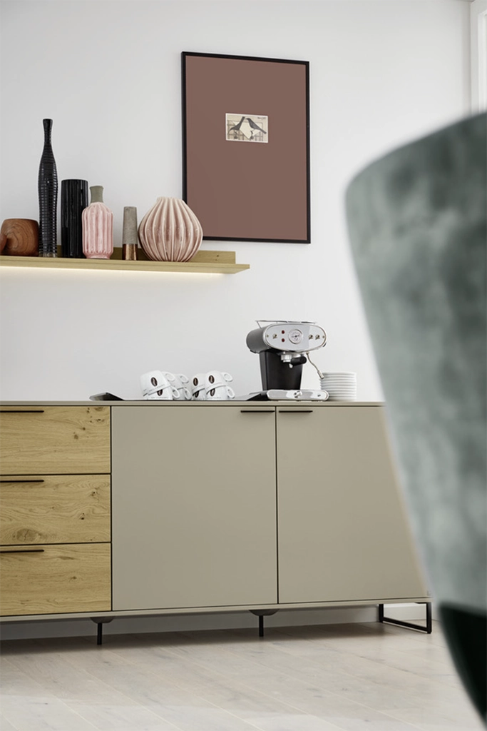 Het Kara Frame woonprogramma van Musterring bestaat niet alleen uit solitaire kasten, maar u kunt alle elementen samenvoegen tot een wandmeubel, zowel zwevend als op een plint of onderstel, waar u al uw wensen in kunt verwerken. Combineer hout met de trendy lakkleuren en u creëert een verrassend effect.