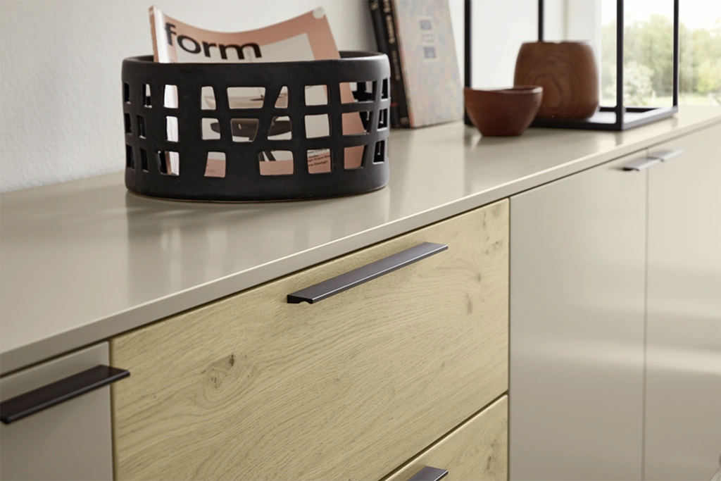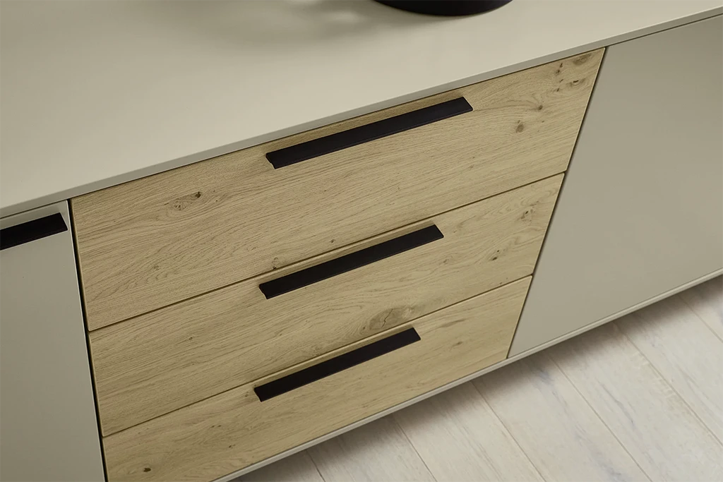 En natuurlijk – handgrepen en knoppen zijn praktisch. Maar het werkt ook zonder. Met het Kara Frame woonprogramma kunt u desgewenst gemakkelijk lades en deuren openen met een lichte druk op de knop.