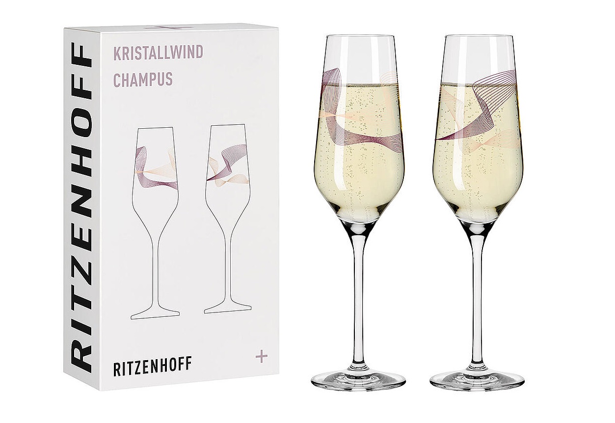 Deze elegante set Kristallwind champagneglazen is van de ontwerper Romi Hügelberg.