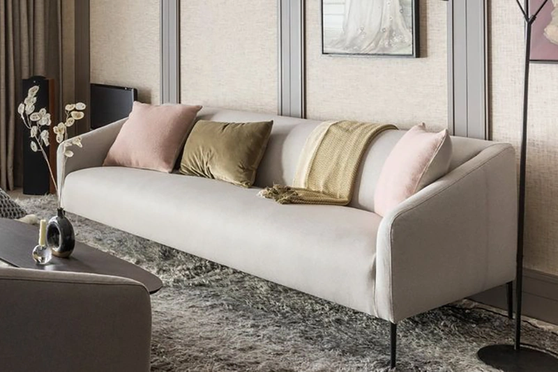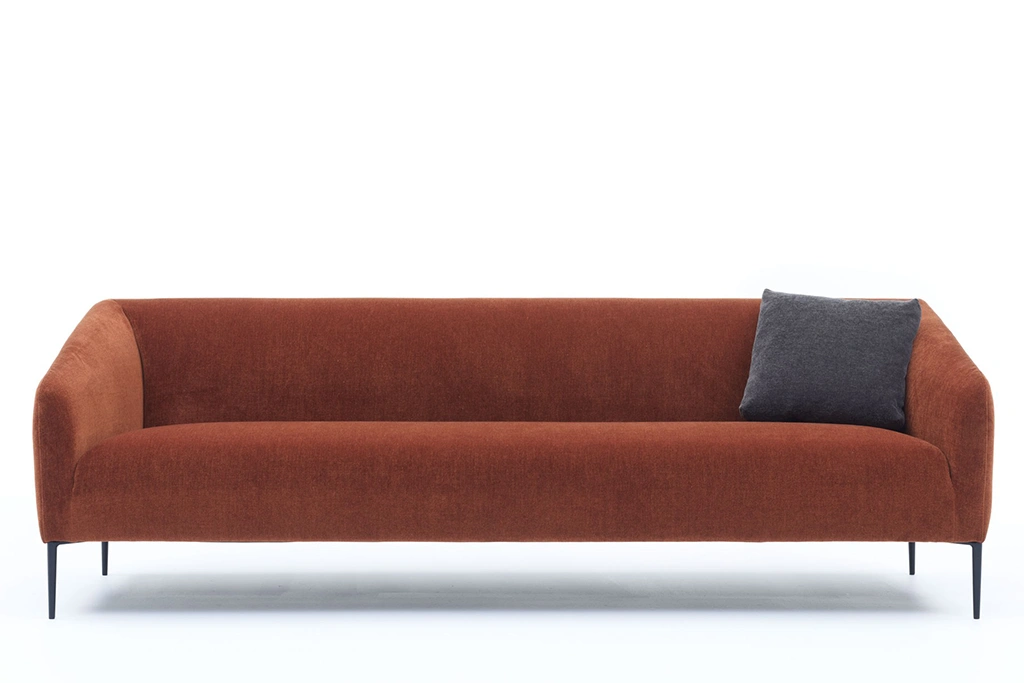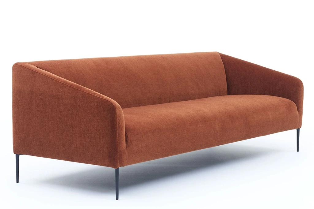 De strakke, schuin aflopende armleuningen van de Kylie zitbank worden verzacht door de ronde, opbollende vormen van de binnenzijde van de leuningen waardoor een indrukwekkende verschijning ontstaan.