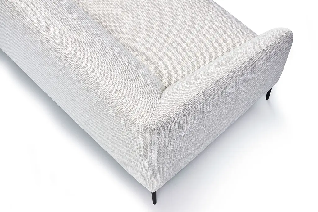 De strakke, schuin aflopende armleuningen van de Kylie zitbank worden verzacht door de ronde, opbollende vormen van de binnenzijde van de leuningen waardoor een indrukwekkende verschijning ontstaan.