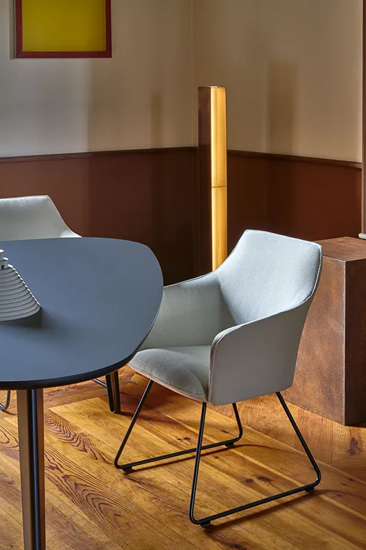 Deze eetkamerstoel is onmiskenbaar een ontwerp van Christian Werner: de rondingen van de zitkuip, de lichte nonchalance van de bekleding en de verfijnde afwerking.