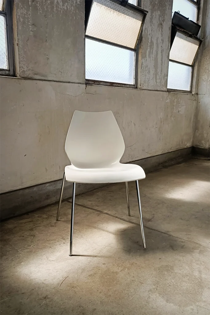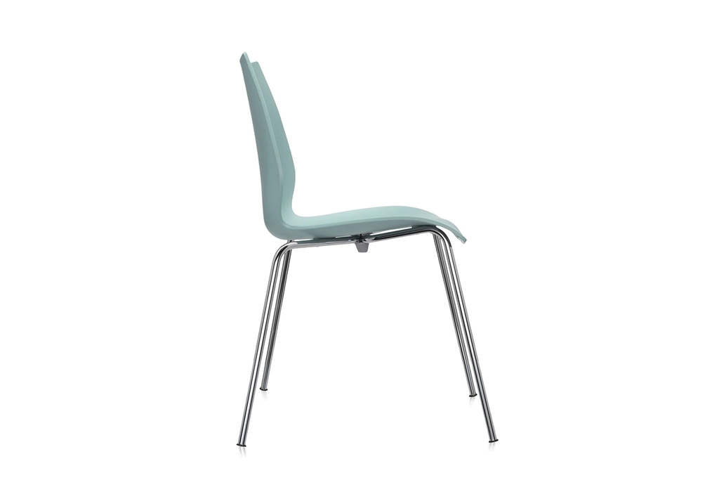De uit één stuk vervaardigde schaal, die als zit- en rugleuning fungeert, bestaat uit polypropyleen en rust op een verchroomd stalen frame. Dankzij de speciale vorm kunnen ze eenvoudig op elkaar gestapeld worden.