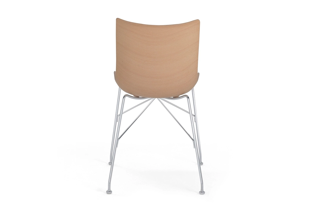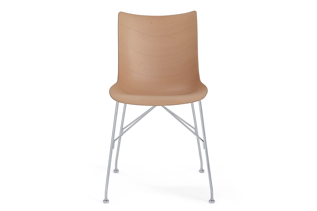 De P/Wood eetkamerstoel beschikt over een zitschaal van gevormd hout voorzien van een laag beuken- of essenfineer en een kunststof zitting. Het frame onder de zitting is gemaakt van staal, voorzien van een verchroomde of zwart gelakte afwerking.