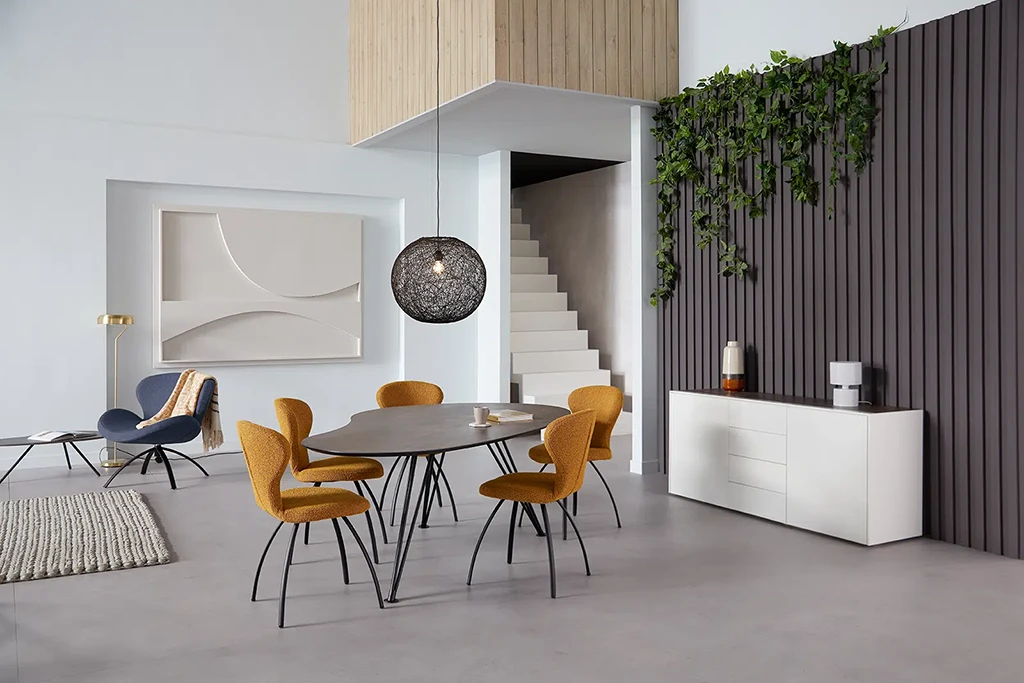 De eetkamerstoel Rikki valt op dankzij haar elegante rondingen die perfect matchen bij het eivormige blad van de eetkamertafel Steely. De combinatie Rikki eetkamerstoel en Steely eivormige eetkamertafel is uitermate geschikt voor diegenen die de eethoek graag een beetje compact willen houden, maar toch lekker opvallend.