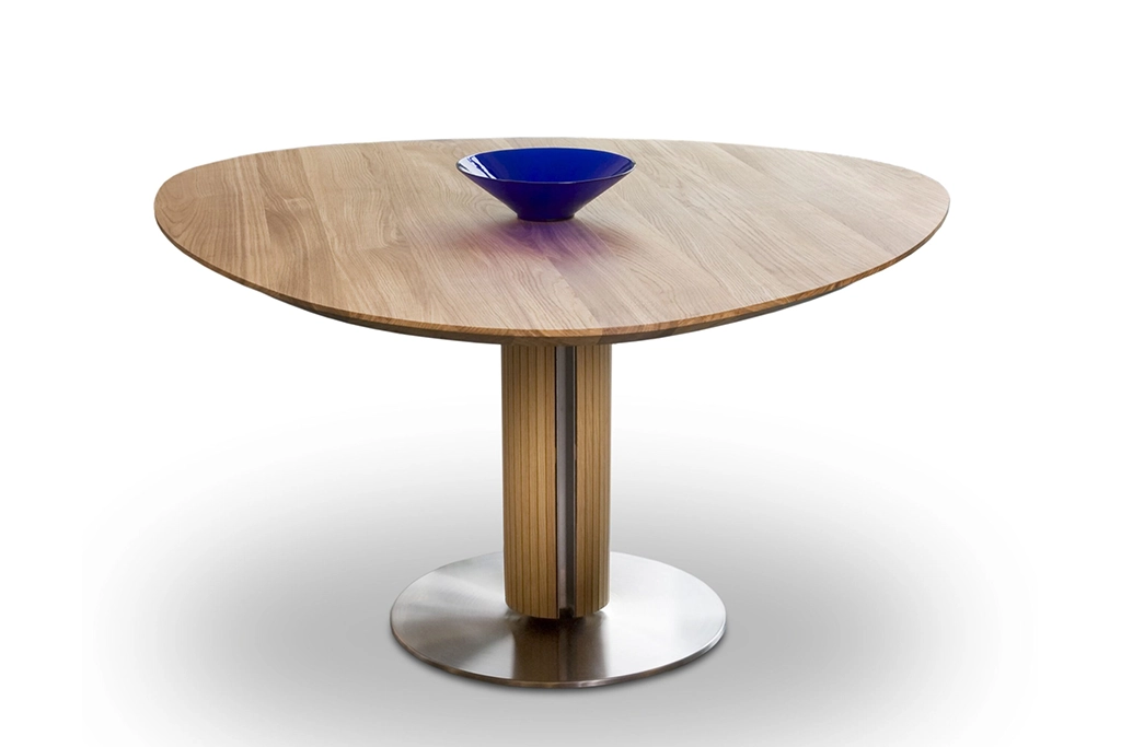 Het tafelblad van de Steely is eivormig en wordt gedragen door een mooi met hout afgewerkte zuil.