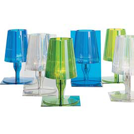 De tafellamp Take is net zoals alle andere designs van Laviani, uitgevoerd in het hoogwaardige kunststof en met de innovatieve technieken waar Kartell om bekend staat. Het doet qua vorm denken aan de traditionele schemerlamp, maar de Take bestaat uit twee tegen elkaar geplaatste plastic platen die elk de vorm en het volume van een halve lamp aannemen. De kap is aan de binnenkant geplooid, waardoor de tafellamp een nieuw- en speelse dimensie krijgt.