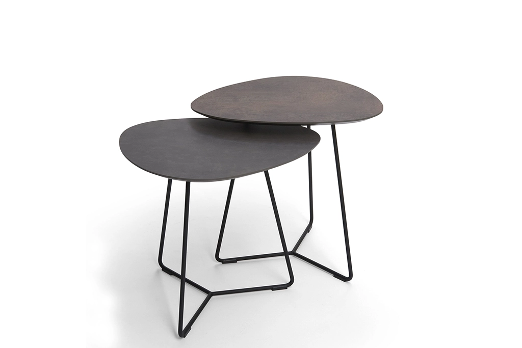 De eivormige tafelbladen liggen op een subtiel, metalen frame dat zowel in RVS of zwart epoxy uit te voeren is.