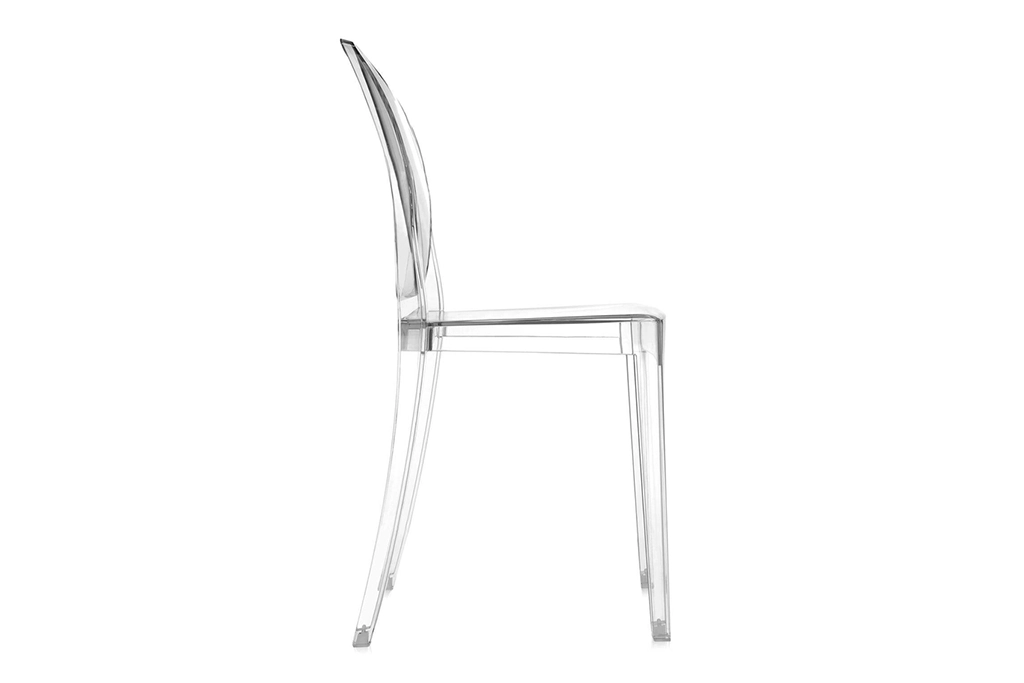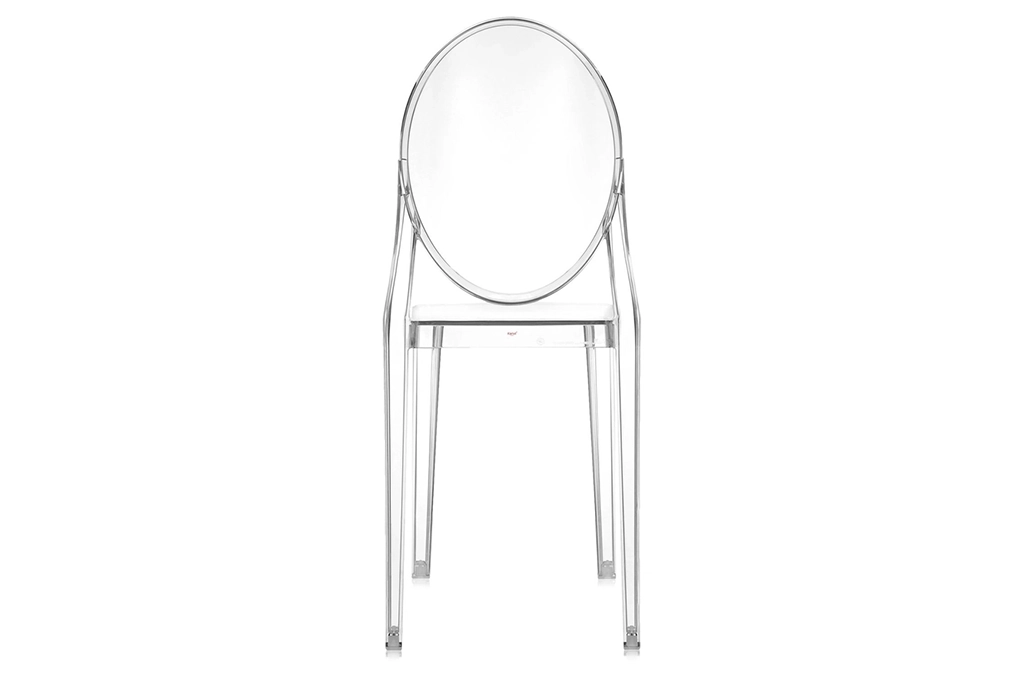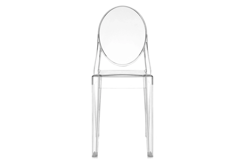 De Victoria Ghost eetkamerstoel van Philippe Starck is een klassieke stoel van transparant polycarbonaat plastic, waardoor de stoel bijna onzichtbaar is – als een spook.